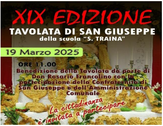 Mercoledì 19 marzo 2025 verrà allestita nella nostra scuola la tradizionale Tavolata di San Giuseppe, giunta quest’anno alla XIX edizione. Gli alunni delle classi V, alle ore 10:00, parteciperanno alla celebrazione Eucaristica presso la Chiesa Madre San Giovanni Battista. Dopo la celebrazione gli alunni in corteo insieme alla Confraternita si recheranno nel cortile della scuola e subito dopo presso l’aula Magna dove alle ore 11:00 assisteranno alla benedizione della tavolata e dei pani da parte di Don Rosario Francolino. In seguito tutti gli alunni della scuola dell’infanzia, primaria e le classi della scuola secondaria di I grado del plesso Puglisi insieme ai docenti, a turno, potranno visitare la Tavolata presso l’Aula Magna della scuola. Come da tradizione, in occasione della Tavolata, la scuola organizza una raccolta di alimenti a lunga conservazione. Gli alunni, in modo volontario, porteranno gli alimenti a scuola entro e non oltre lunedì 17 marzo 2025. Al termine della manifestazione le pietanze della Tavolata e gli alimenti raccolti saranno consegnati alle Associazioni delle Parrocchie del territorio che provvederanno a distribuirli alle famiglie bisognose.